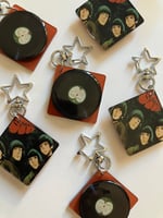 The record spins smoothly and easily. The keychain is about 1.5” and made of acrylic.